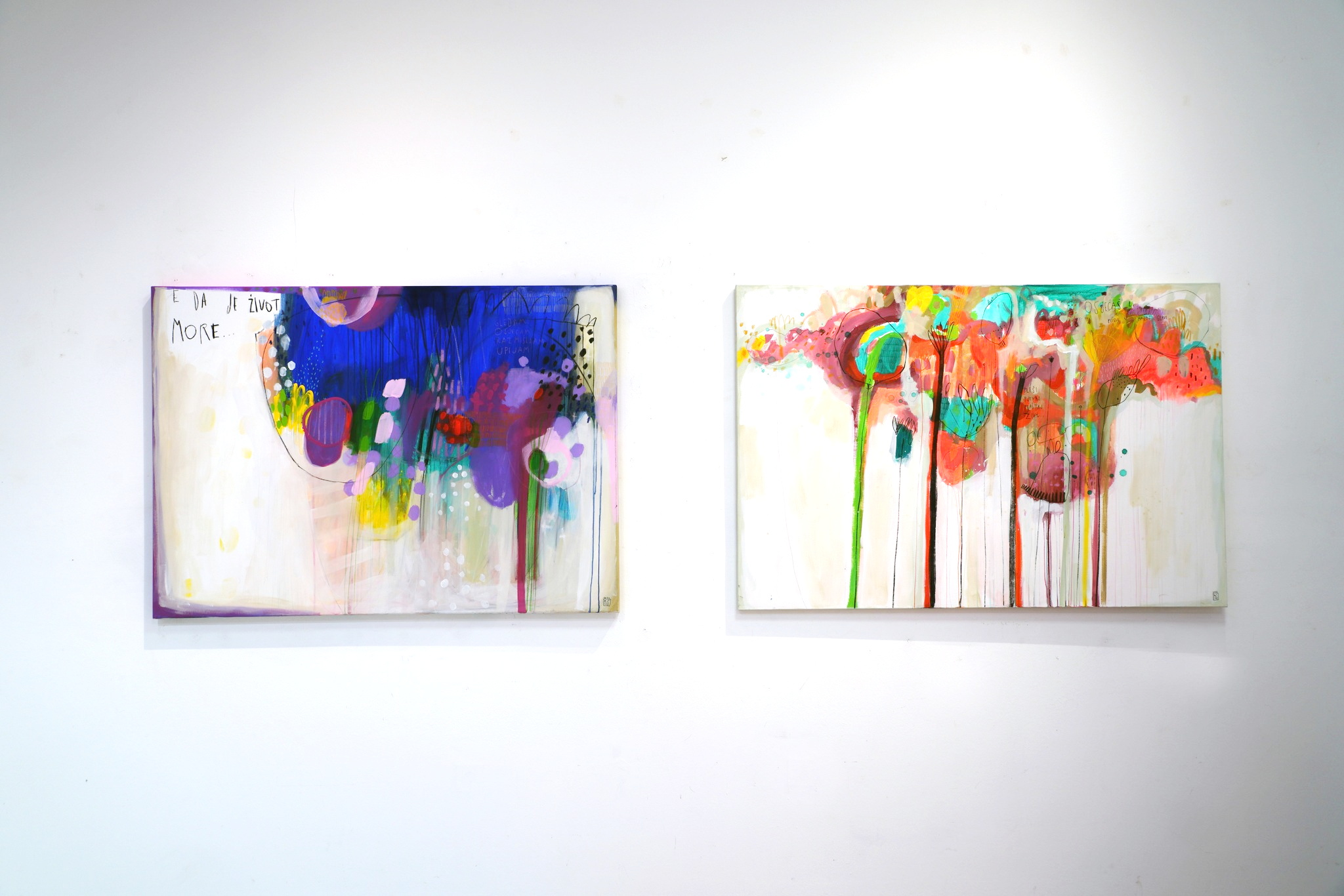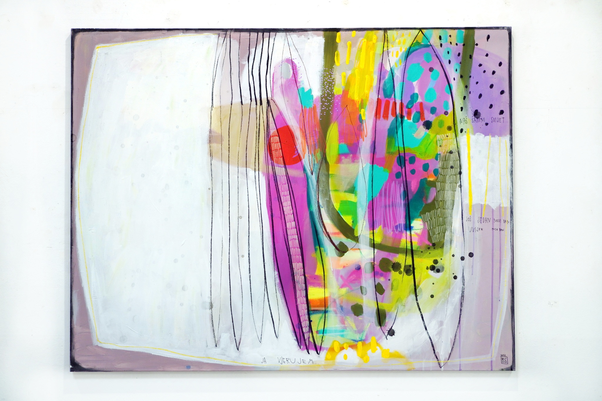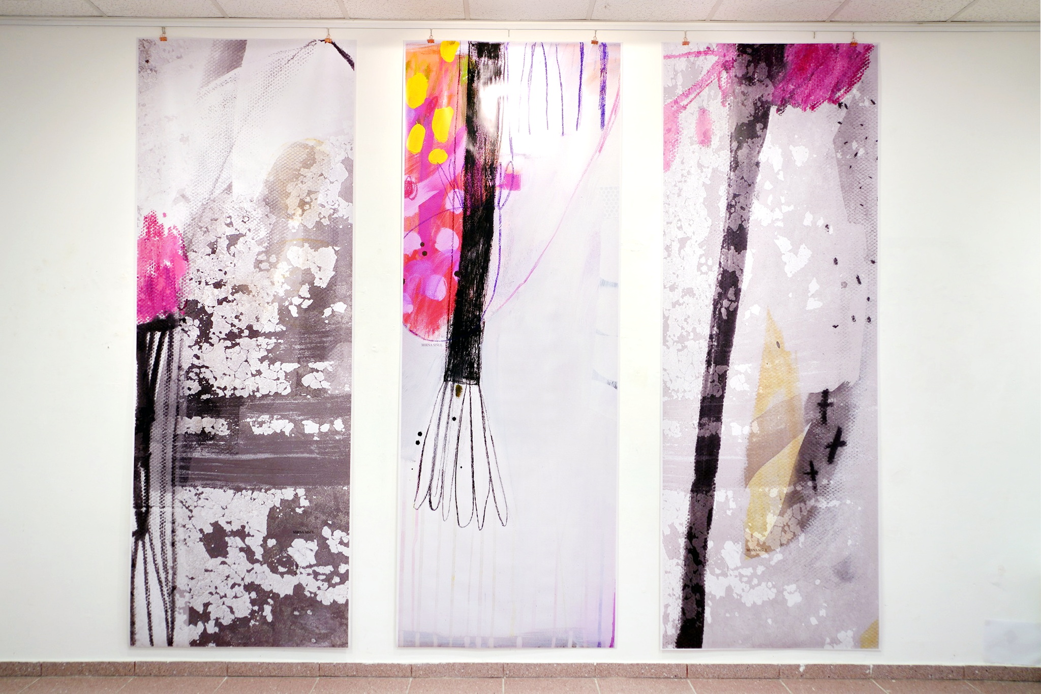 Slikovni zapisi Mirne Sišul satkani su od laganih i vedrih boja te znalačkih i definiranih linija koje prepoznatljive i svojstvene poput samog potpisa autorice daju oblikovnost sadržaju pričajući metaforama i poetikom. Umjetnica nas ovom izložbom u Galeriji Juraj Klović pušta da sagledamo njezin proces stvaranja krećući od samog početka, od ideje. Put nas vodi od nemirnog impulsa ruke i skica malih dimenzija u tragove lazurnih i nježnih kompozicija. Poput dnevnika, to su zabilješke jednostavnih tonova i formi, oslikana razmišljanja prepuna suptilnosti i magičnosti. Ležernost tih uradaka rezultat je dugogodišnjeg rada i mogućnosti nastale u spoju upornosti, kreativnosti i potencijala mašte. Slažući skice u kompozicije pretvara ih u moćnu cjelinu, u priču, te svaki zapis poput note pronalazi svoje mjesto u konačnici vizure. Taj početan naboj razmahao se u njezinim većim radovima gdje ništa ne ometa slobodu rada i razmišljanja, lakoću poteza kista i razigranosti. Upravo u njima ona pokazuje svu snagu svoje likovnosti pune vitalizma i skladnih motiva. Izmaštani prostori bogatih kolorističkih suglasja nastaju na granici sna i jave. Ona se igra našim percepcijama, zavodi oblicima i suprotnostima. Kontrastne plohe prepune su boja i crtica, točkica, krivulja, natpisa, neobičnih oblika i simbola; ponekad je to cvijet, oblak, drvo, ptica u daljini, a ponekad samo nagovještaj koji čeka svoje tumačenje. U suprotnosti s njima uvijek dolazi ravnoteža, ostvarena u bjelinama koje su začudo dominantne, donoseći meditativnost i mir.