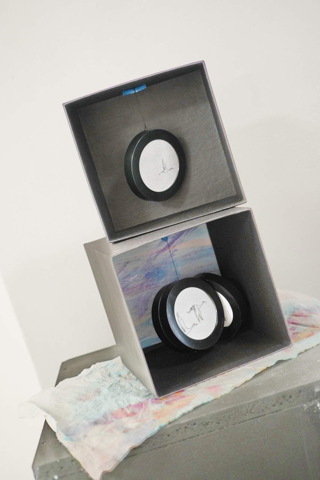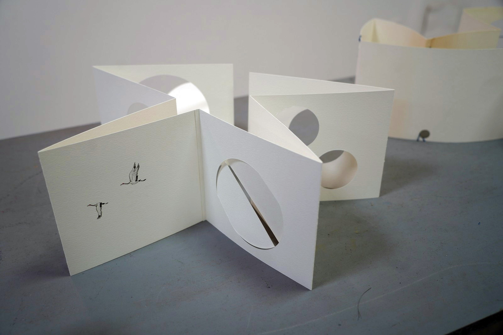 Iako malenih dimenzija, razaznajemo ljepotu pokreta krila, naslućujemo trepet perja i mirnoću trenutka. Imaginacijom slagalice, motivi se otvaraju i igraju sjenama. Iako zaustavljene, ptice ne miruju – dovoljan je dah vjetra ili korak prolaznika, a list papira zatreperi, oživljavajući prizor. Otvaranjem umjetničkih knjiga, one izvode svoj zavodljiv ples intiman i poetičan, mijenjajući se iz stranice u stranicu, unutar modrine udaljenih planina i naznačenih zelenih krajolika livada. Slika se često pretvara u sam objekt, a tada započinje mijena tonova; svjetlo i sjena stvaraju volumen, iluziju dubine i prostornosti.